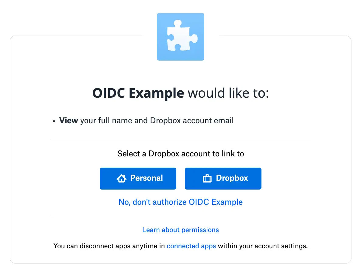 OpenID Connect—or OIDC—is an identity layer. It lets you build support for signing into your application via the user’s email verified Dropbox identity, which reduces the number of steps for a user to sign up for your service.